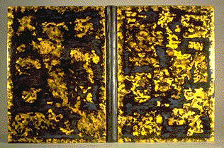 Black calf spine, lacquered gold leaf and enamel over gessoed