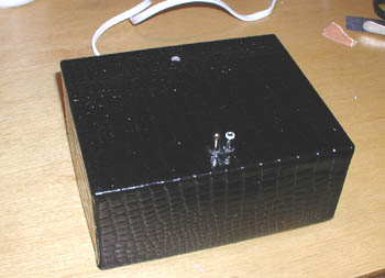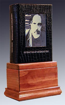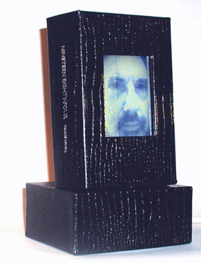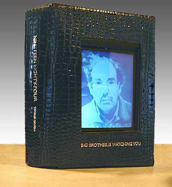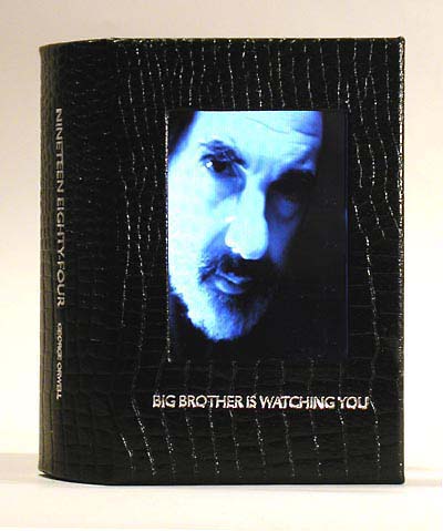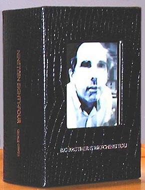 Lizard-grained cowhide, white metal foil stamped title and slogan.. LCD monitor embedded in cover with miniature video camera hidden behind leather with 1/8" hole for lens. When you hold the book you see yourself on the screen. The original 1949 binding is preserved within the new one. The base above recharges the battery pack that runs the system when it is off the base.  While on the base the screen power is supplied by a separate transformer to enable continuous operation when the book is on display. The base has an indicator light that is green while charging and turns off when the battery pack is fully charged.
