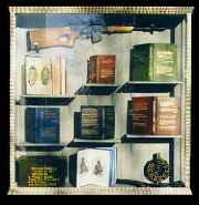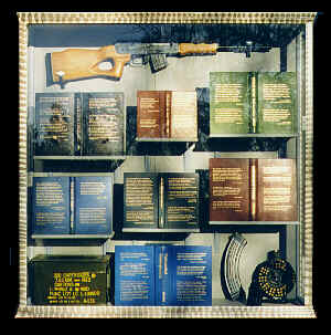 Each book is rebound in Nigerian goatskin, with a quote excerpted from the book tooled in 23k gold on the cover. The endpapers of each book are targets made of images representing the subject of that volume, printed in color on Rives BFK or handmade paper on an Epson Stylus 1500 printer. The targets were taken to a shooting range and shot by Minsky with the Norinco MAK-90, an Enfield 2A-1, and a Ruger 10-22, at distances of 50 feet to 100 yards. Two of the books are shot through the covers. The books are displayed in a snakeskin case designed and constructed by Minsky, with Plexiglas sides and sliding doors. Above the books is a Norinco MAK-90 Sporter, a semiautomatic version of the AK-47 assault rifle. Also in the case are 1,000 rounds of ammunition, two five-round hunting clips, a loaded 40-round "banana" magazine, and a loaded 75-round drum magazine.