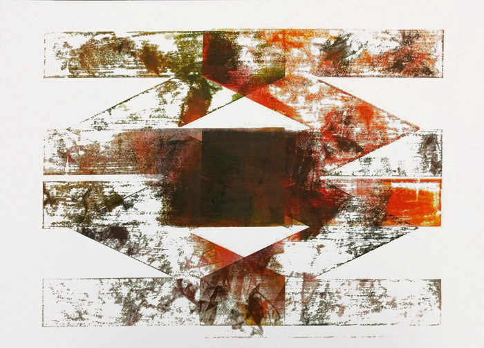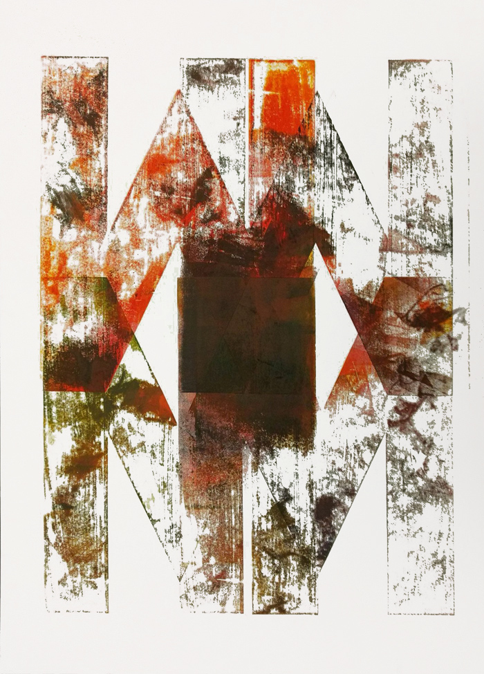 This unique print was made with a single large wood type M. Two visiting artists assisted with the presswork, Heather R. Buechler, Victor Hammer Fellow at Wells Book Art Center, and David Armes, proprietor of Red Plate Press.  It has no defined orientation and can be hung horizontal or vertical.