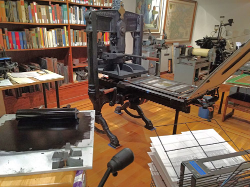 In April, 2017 Richard Minsky was Artist-in-Residence at the RIT Cary Graphic Arts Collection. He printed Vermont Vigilance and other works on the same Albion handpress acquired in 1895 by William Morris for his Kelmscott Press to produce the magnificent Works of Geoffrey Chaucer. The press was brought to the USA in 1924 by artist and type designer Frederic W. Goudy. The Minsky residency was arranged by Dr. Steven K. Galbraith, Curator of the Cary Collection, and facilitated by Associate Curator Amelia J Hugill-Fontanel.