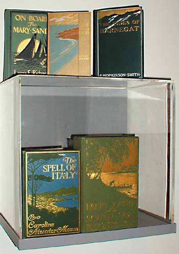 Below: Water is a seductive design motif. On Board the Mary Sands silhouettes a sailboat in the moonlight, an Adrian Iorio design from 1911. Love and Rocks is a very advanced 1898 design from the Boston publisher Estes and Lauriat. This sort of use of flat light color and gold became popular in the Art Deco era a generation later. The Tides of Barnegat is a1906 example of Frank Berkeley Smith's work. The exhibition has a wide variety of his designs, and other designers' use of the "landscape at the top of the cover."