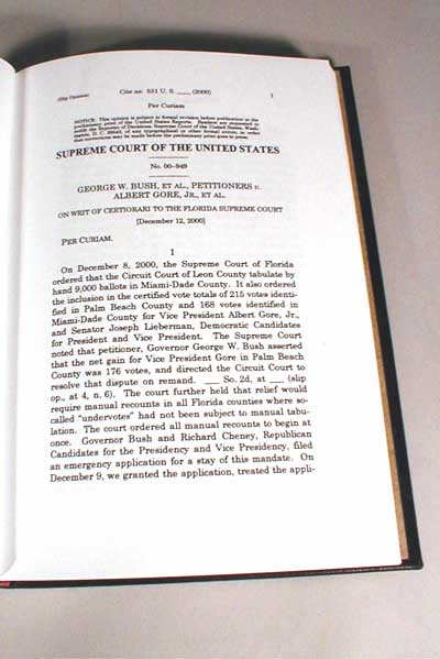 This is the decision of the Supreme Court in the landmark case that determined the outcome of the 2000 election, Bush vs. Gore. This ruling, overturning a decision of the Florida Supreme Court, is arguably the most significant Federal intervention in states' rights in modern history. The edition was designed by Minsky using the texts of Justices concurring and dissenting opinions. It is printed by photocopy from the output of the Adobe Acrobat (.pdf) file downloaded by Minsky from the Supreme Court website the day it was issued, December 12, 2000. The paper is Southworth  100% cotton fiber paper. The binding is in classic law book style of full leather with raised bands. Red and black leather labels have the title in 23k gold and the roman numeral "X", in a cloth slipcase with the text of the tenth amendment inset in gold on black board.