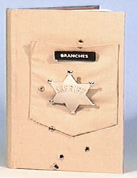 Each copy of the book has 9mm bullet holes shot through the cover by Minsky, a Sheriff badge, and the title affixed as a name badge. The photo on this page is of the prototype, completed by Minsky on April 27, 2000. Each copy of the book is slightly different. This special limited edition of the first edition of Branches includes color prints of the 16 illustrations, tipped in over the black and white reproductions in the book. The binding was commissioned by the publisher: The Permanent Press. The edition consists of one hundred copies and five artists' proofs. Click on the picture for more photos and details.