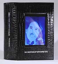 Lizard-grained cowhide, hologram foil stamped title. LCD monitor embedded in cover with miniature black and white video camera hidden behind leather with 1/8" hole for lens. When you hold the book you see yourself on the screen. Not truly an edition as each copy is slightly different. There are three different 1949 editions (U.S., U.K. and Canada). Some copies may also incorporate the films in VHS or CD format, including the 1954 BBC TV version, and the 1956 and 1984 film versions. It may be ordered with a wireless transmitter from the embedded camera and a receiver for a remote monitor. This is particularly useful for museum installations.