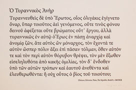 In Book 8 of The Republic (Πολιτεία) Plato discusses the reasons that democracy leads to tyranny, and in Book 9 describes the evolution and character of the tyrannical man. Minsky selected this quote and adapted an English translation from several sources. Printed in Greek on the Kelmscott-Goudy Albion handpress at the RIT Cary Graphic Arts Collection. A copy of the translation comes with each print.