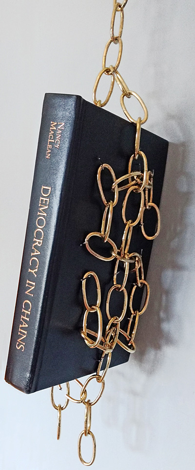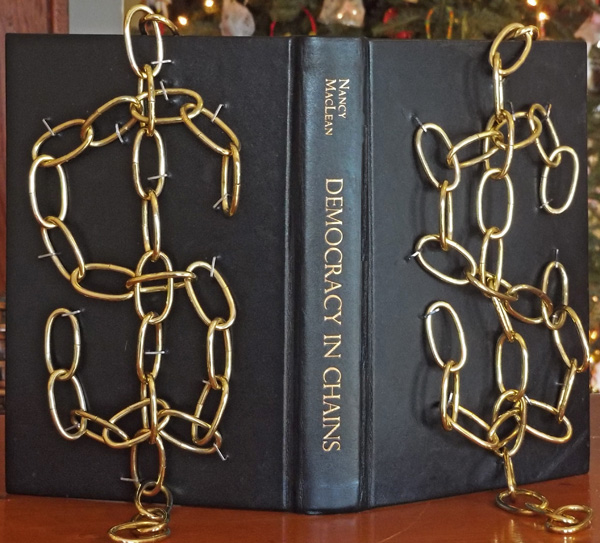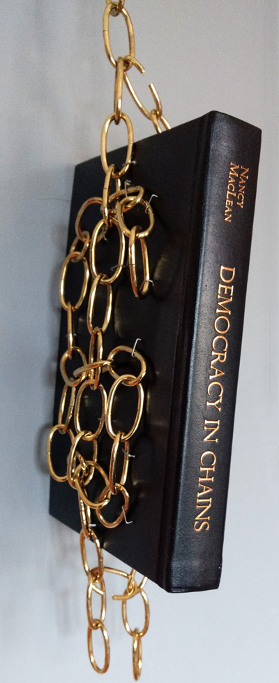 The book's description includes: "An explosive exposé of the man who devoted his career to shackling democracy -- and succeeded. Libertarian billionaires are using their wealth to drastically curtail the US democratic process, disempowering ordinary citizens whilst entrenching the influence of corporations as never before. In Democracy in Chains, award-winning historian Nancy MacLean reveals how the ideas of Nobel-Prize winning political economist James McGill Buchanan have been used to undermine the power of voters in a country whose Constitution is founded on the principle 'We the people'. Now, with Mike Pence as Vice President, this chilling movement has a loyalist in the White House, as well supporters in the House, the Senate, a majority of state governments, and the courts. Democracy in Chains is a timely and important book, which should be read by anybody interested in the future of democracy."