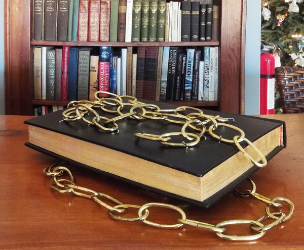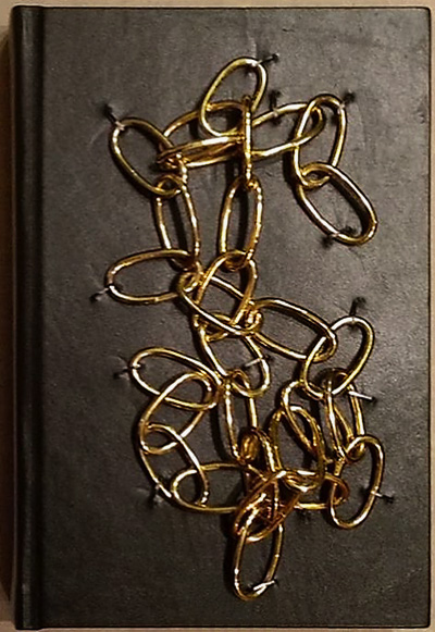 The chain is attached somewhat loosely so it can be jumbled or defined into a dollar sign. This relates to the book's subtitle. The edges of the book are 24K gold leaf over Armenian Bole. The staples are stainless steel.