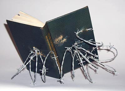 The barbed wire springs back to form a reading stand.The authors propose that there is too much freedom in contemporary democracies, and that it is necessary to curtail personal freedoms in order to preserve the governability of democracies. In 1980 the choice in the USA presidential elections was of three teams, all of which included at least one member of the Trilateral Commission, an organization founded in 1973 by David Rockefeller and Zbigniew Brzezinski. I exhibited this book as a political commentary, choosing the materials to reflect the metaphor of the text.
