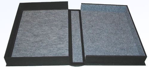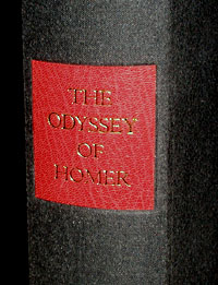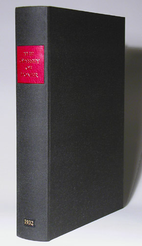 Lacquered black cloth, 23K gold stamped labels in Centaur type (the book is set in Centaur), red leather for the title, black leather for the date, lined with gray felt.