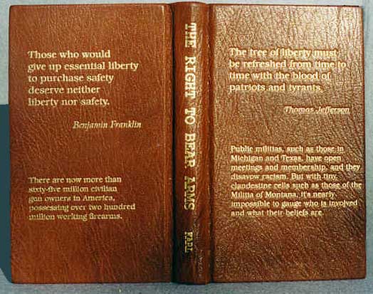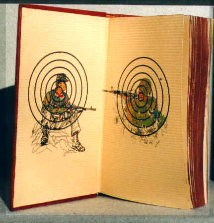 Bound in russet Nigerian goatskin, with quotes from the book in 23K gold on the covers. Endpapers are Fabriano Roma paper, printed on an Epson Stylus 1500 inkjet, and shot at 25 yards with a Ruger 10/22 semiautomatic rifle. 6 1/2" x 4 3/4".