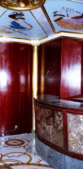 The feeling when you look up at the ceiling is that you are under water looking toward the surface, with its interplay of light and shadow. Fish are swimming in all directions. The painting was done by Minsky in a studio on the grounds of the Chateau while the ceiling to the left was being installed.