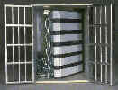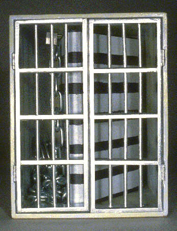 Chain binding with handcuffs and padlock, painted in acrylic prison stripes over publisher's binding, with isbn number stamped in hologram foil, in a case with jail doors. Acrylic/latex over wood. The book was published by G.K. Hall in 1990.