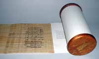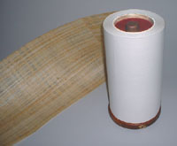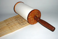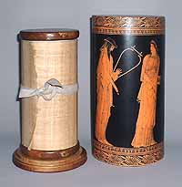 Bound as a scroll. Papyrus endpaper printed inkjet with reproduction of Sappho text from early scroll fragment. Wood endcaps with oil base stain, 23K gold leaf, polyurethane and lacquer. Inset brass bushing for cedar scroll handle, which is contained in scroll center under removable endcap. Scroll cover is lacquered inkjet adapted from Greek Krater image of Alcaeus and Sappho.