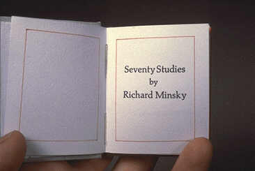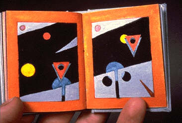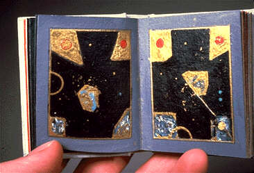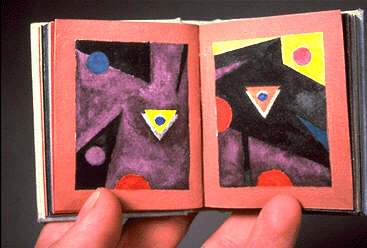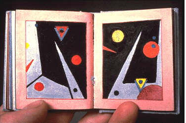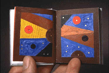 Letterpress title page, watercolor and acrylic paintings with gold leaf on paper. Flat-back case binding. Lacquered acrylic on bookcloth. Each two-page spread is a study for a bookbinding design. You can also look at some finished bindings related to these studies.
