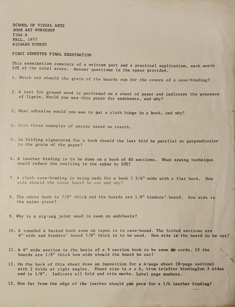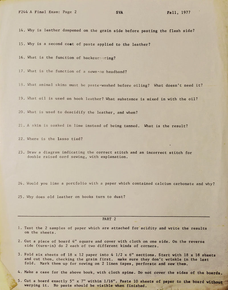 Scroll down to see another found document, the final exam for the bookbinding segment, fall 1977.