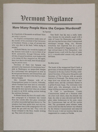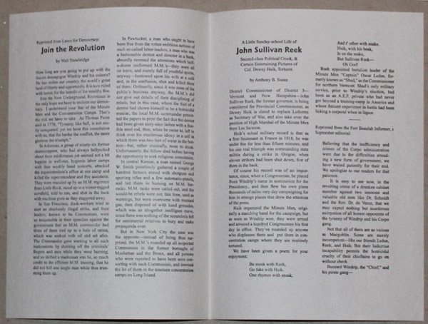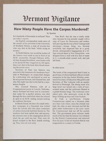 A fictional four page pamphlet in It Can't Happen Here by Sinclair Lewis (1935), a novel in which a populist president is elected in the USA and becomes a demagogue. All laws were made to benefit corporations. After the 2016 election it became a best seller. Vermont Vigilance is published by the New Underground resistance on "an old hand printing-press" stolen from the basement of the newspaper office where the protagonist was editor, using 8 point type stolen a pocketfull at a time. One way of distributing the pamphlets was to surreptitiously insert them into other publications.